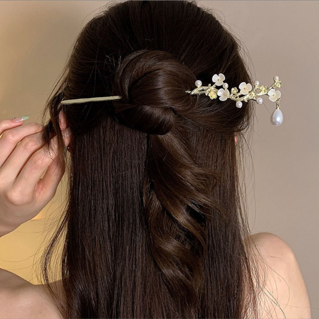 은은한 꽃가지 물방울 진주 드롭 올림머리 비녀